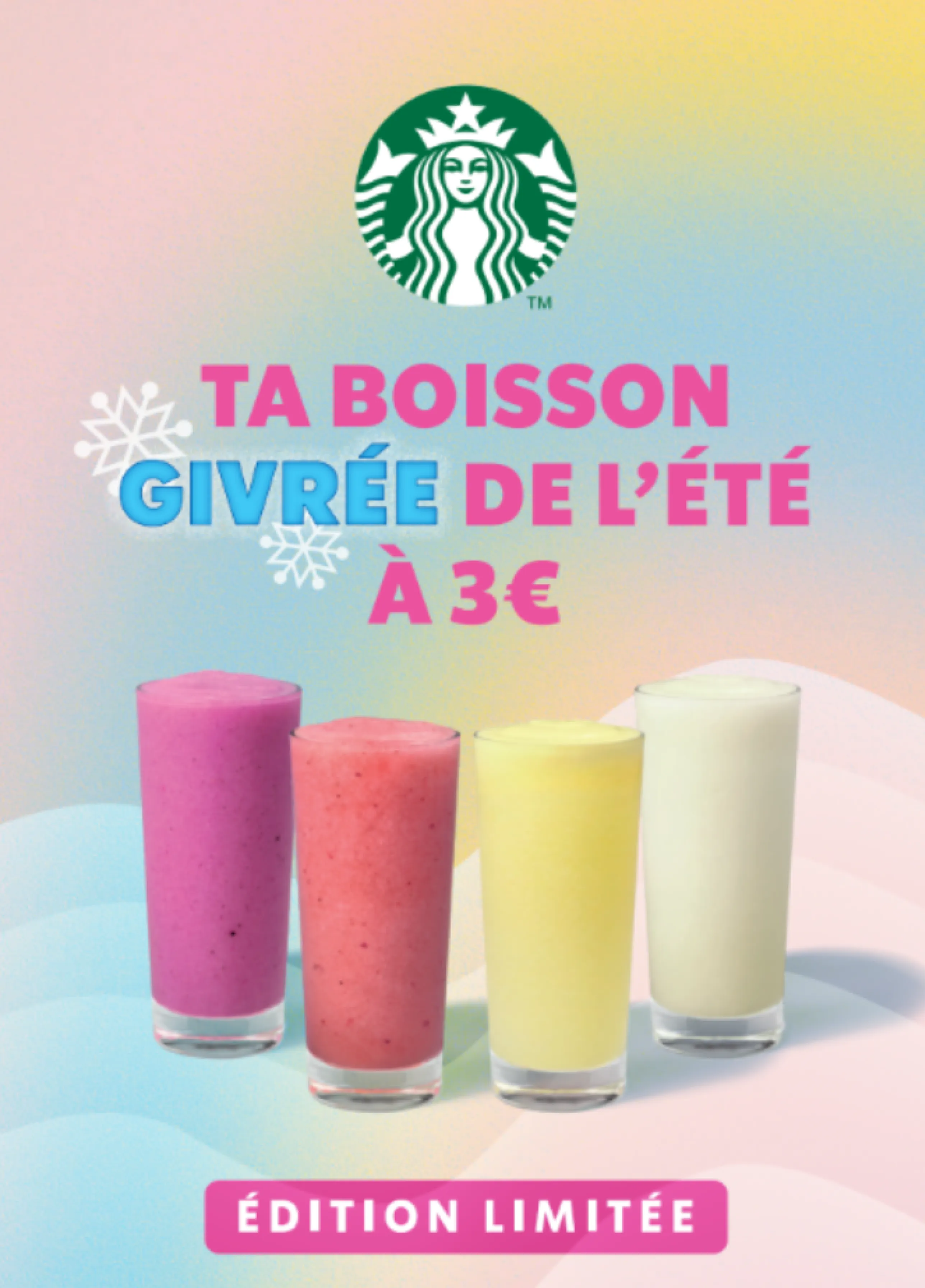Profite du Frozen Refresha de ton choix en taille Tall à 3€. Offre valable jusqu'au 30 Juin 2025. Offre non cumulable avec d'autres promotions en cours sauf programme Starbucks Rewards, et offre non échangeable, non rétroactive ou remboursable en espèces.